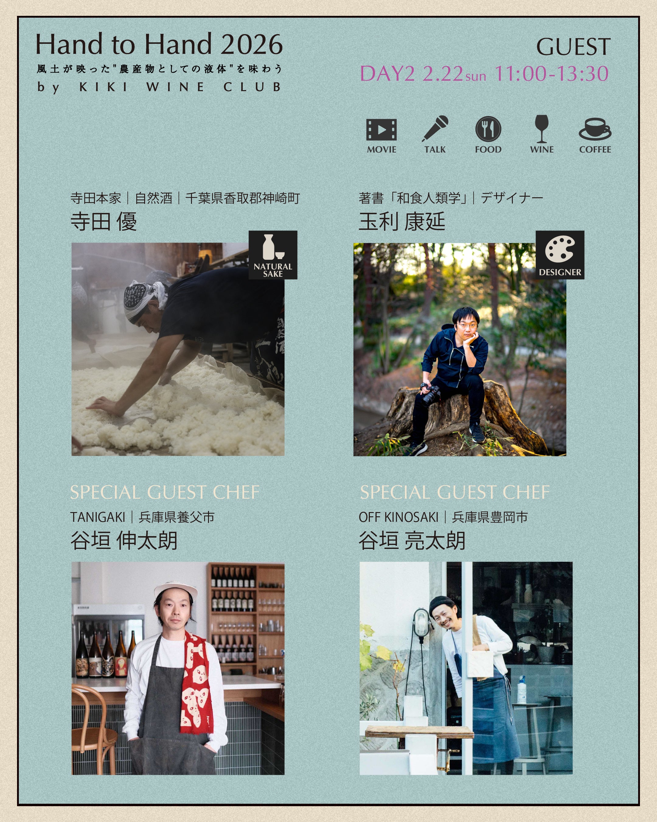 2026年2月21日(土)22日(日)の2日間、「手から手へ。生産と消費の循環が育む、私たちの食文化。」をコンセプトに、日本中から集まった醸造家とともに、KIKI WINE CLUB主催のワインイベントを開催します。ワインや焼酎、日本酒を飲み比べながら、 兵庫・養父市のレストラン"tanigaki"の谷垣伸太郎シェフ、兵庫・城崎市のレストラン"off"の谷垣亮太郎シェフによるスペシャルなコースをいただきながら、トークセッションをお楽しみいただけます。
